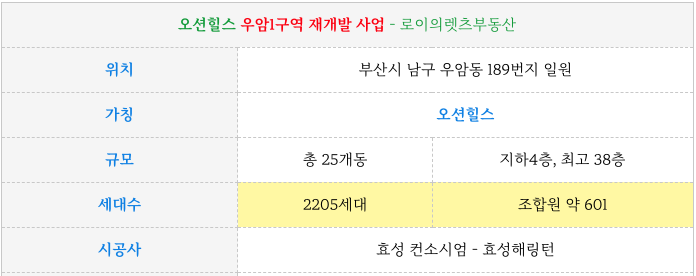 오션힐스 우암1구역 재개발 구역의 간략한 특징 다시 한번 정리하여 정리해 드립니다.