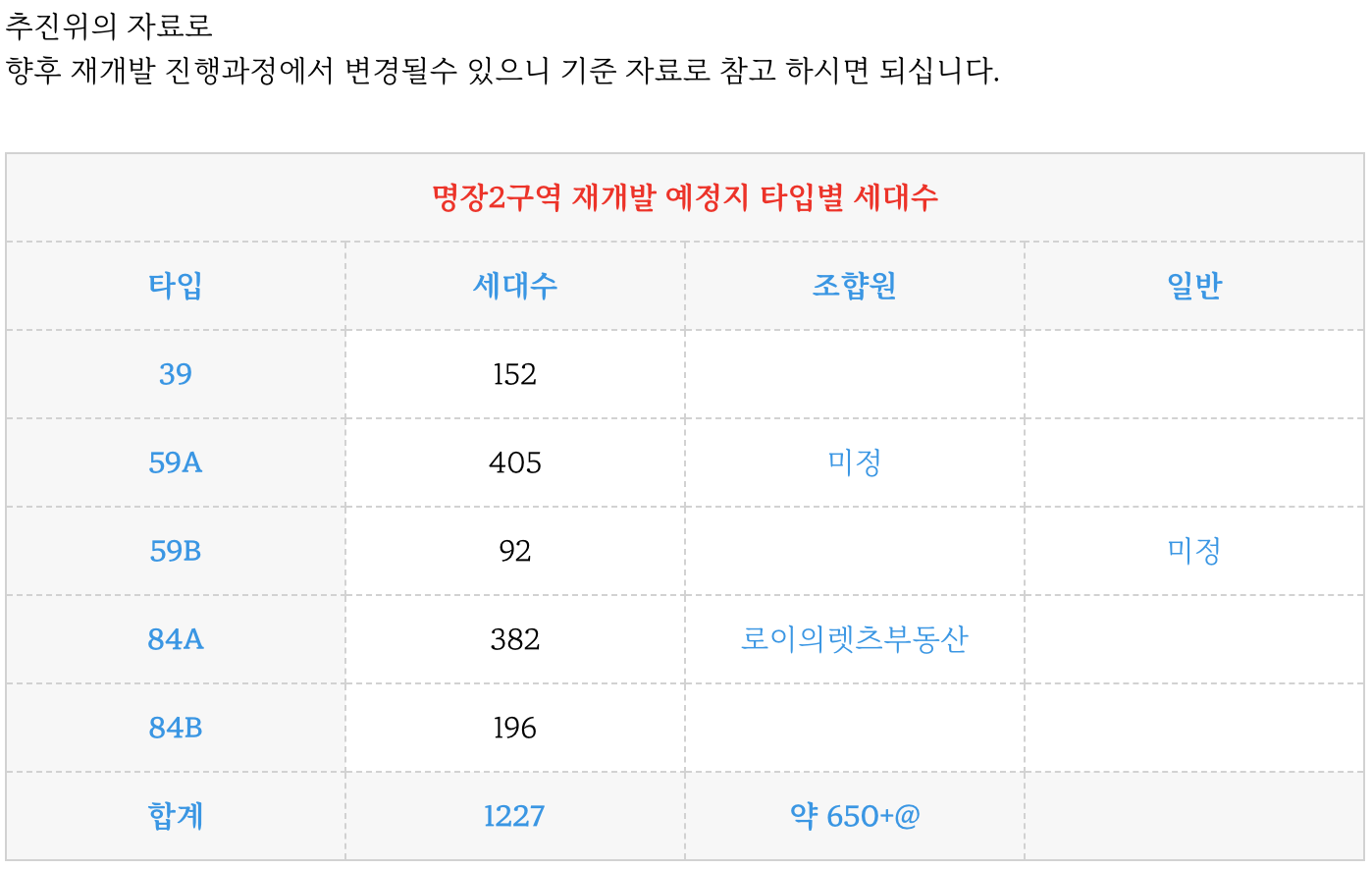 동래구 명장2구역 재개발 예정지의 현재 예상 타입별 세대수 입니다.