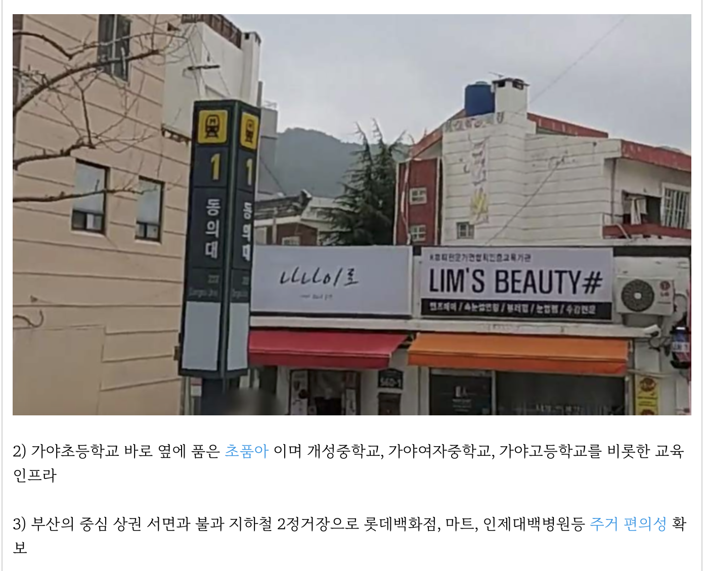 - 지하철 준역세권, 브랜드 대단지, 초품아, 주거편의성 좋은, 부산중심도심, 시내-시외 접근성좋은