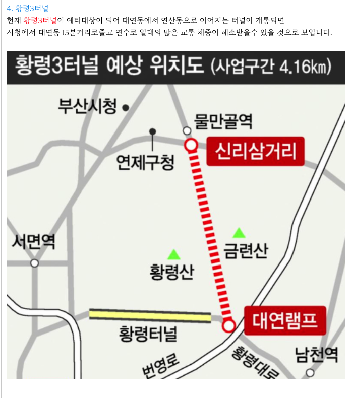 현재 황령3터널이 예타대상이 되어 대연동에서 연산동으로 이어지는 터널이 개통이 되면
