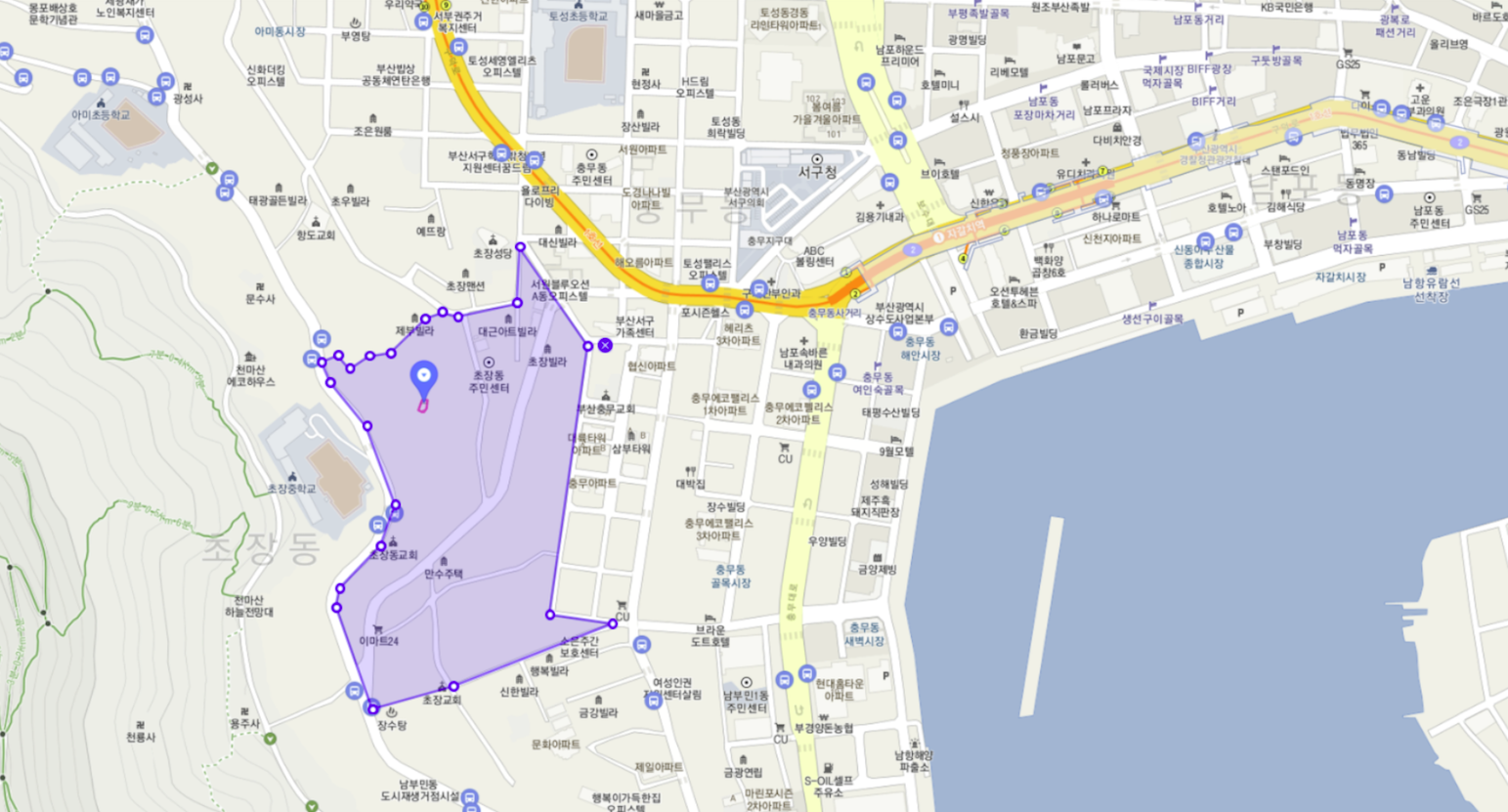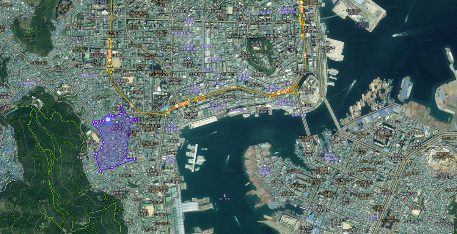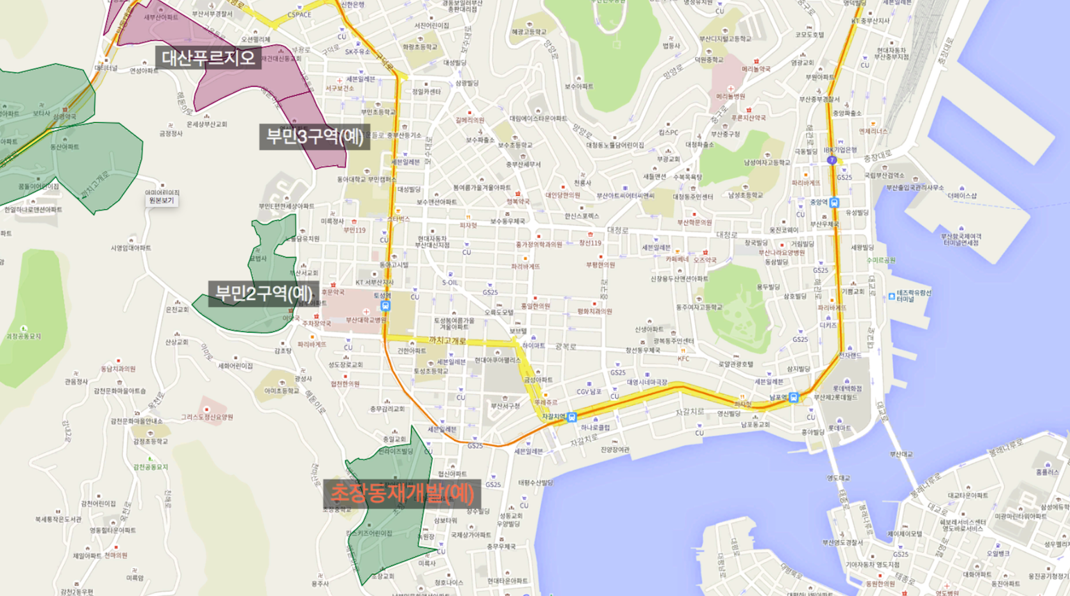 그 아래로 부민3구역, 부민2구역이 있고 그 아래 초장동 재개발이 위치해 있어