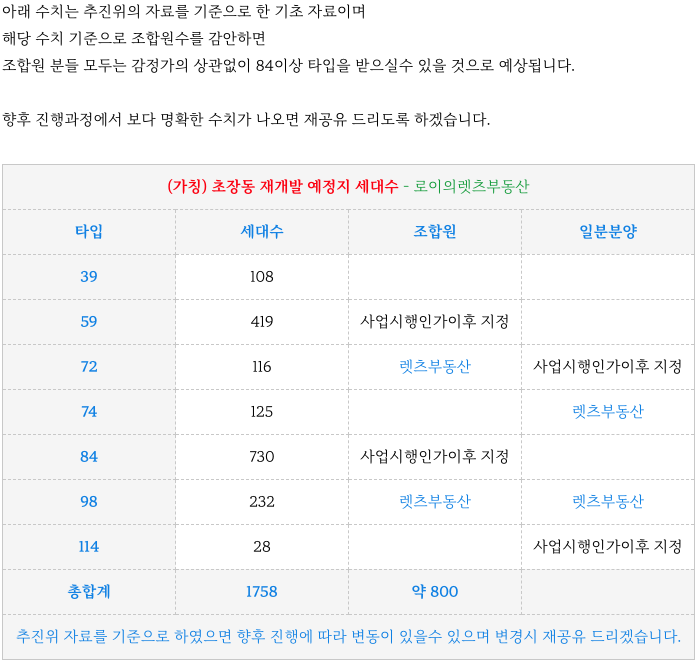 초장동 재개발 예정지의 추진위의 추정 예정 세대수 입니다.