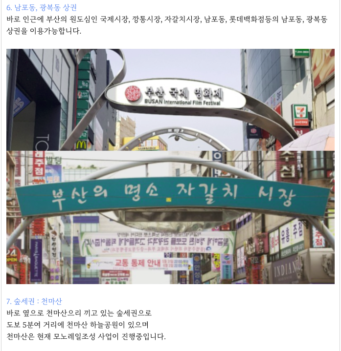 부산 최고의 수산시장인 자갈치 시장과 깡통시장, 국제시장등 남포동, 광복동 상권 이용이 편리하며