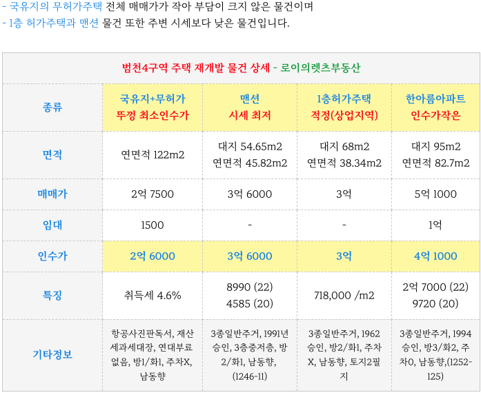 - 국유지의 무허가주택 전체 매매가가 작아 부담이 크지 않은 물건이며