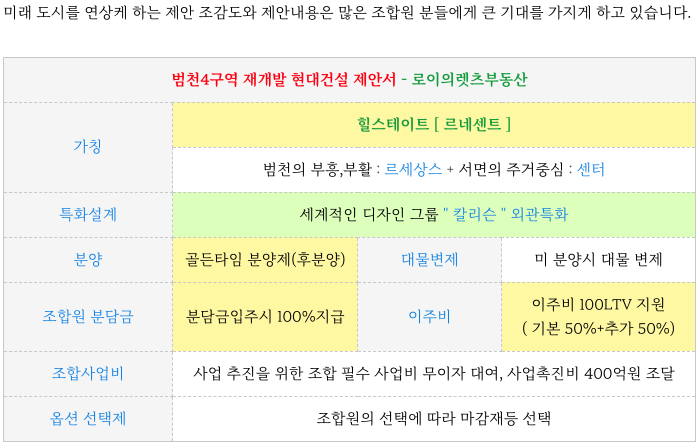 범천4구역 재개발 ( 힐스테이트르네센트 )의 시공사인 현대건설 의 제안내용 입니다.