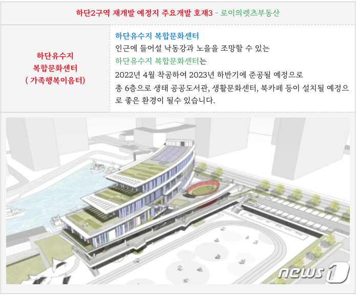 하단유수지복합문화센터 ( 가족행복이음터 )는 하단의 주요 문화 센터로 실거주에서의