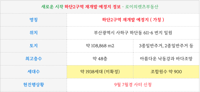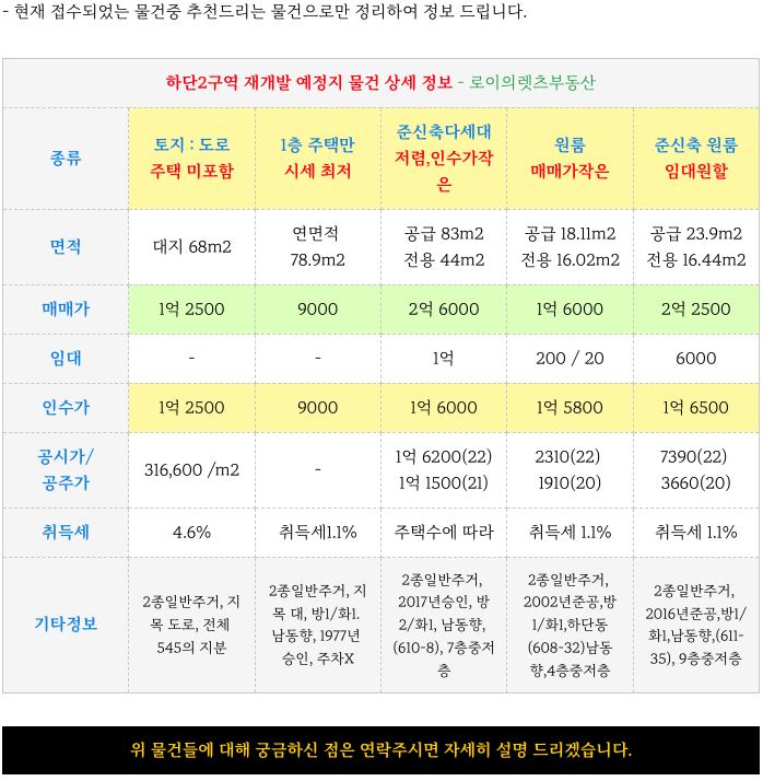 하단2구역 재개발 예정지의 물건 정보를 업데이트 하여 드리겠습니다.