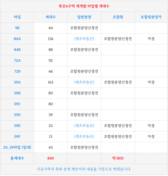 시민공원 촉진4구역 재개발의 각 타입별 세대수