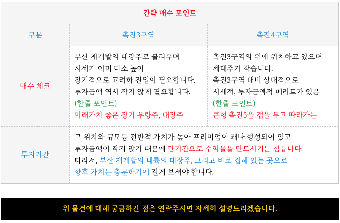 촉진4구역과 촉진3구역 재개발의 물건들의 매수시 체크 포인트를 간략히 다시 정리해 드리겠습니다.