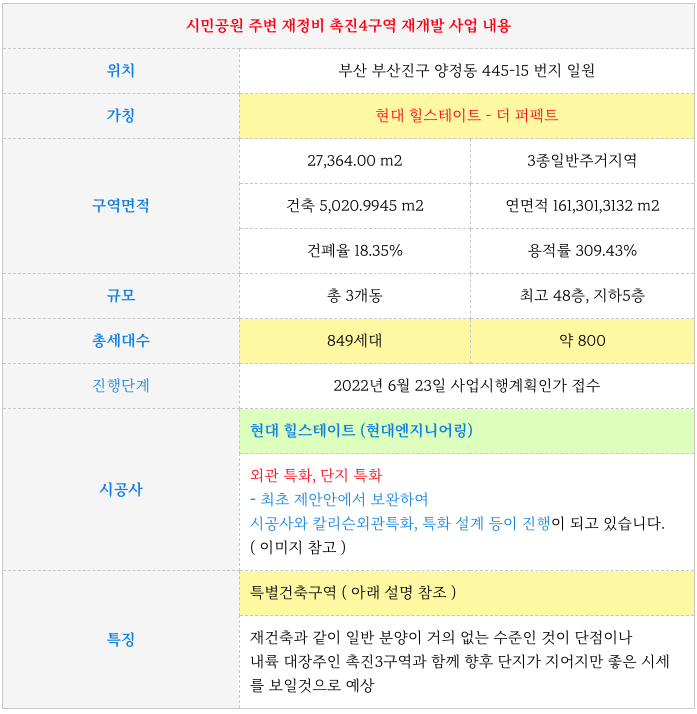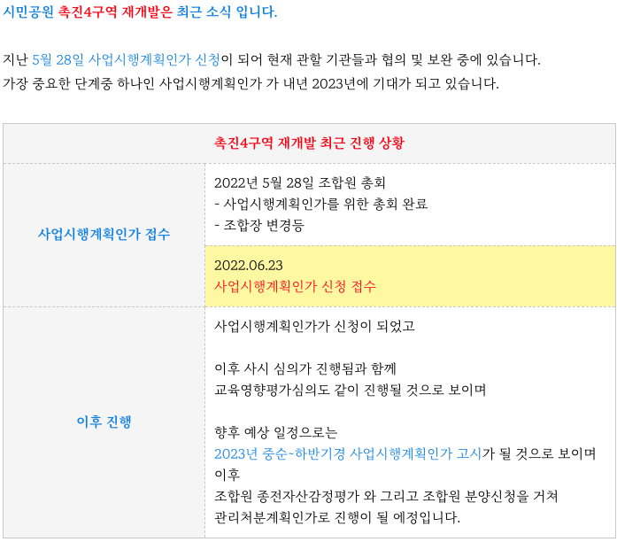 사업시행계획인가 신청된 시민공원 촉진4구역 재개발의 진행 상황 정리등 추가 정보는 아래 페이지를 참고 부탁드립니다.