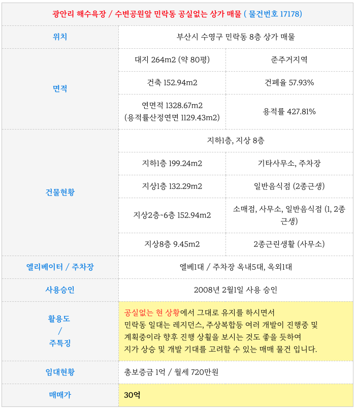 부산 수영구 민락 수변공원 상가 건물 매매 (8층 건물)