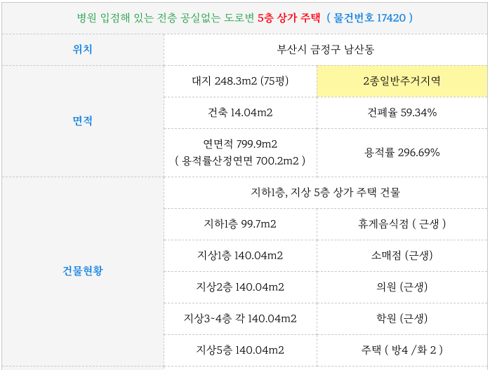 부산 금정구 남산동 병원 입점해 있는 전층 공실없는 도로변 5층상가주택