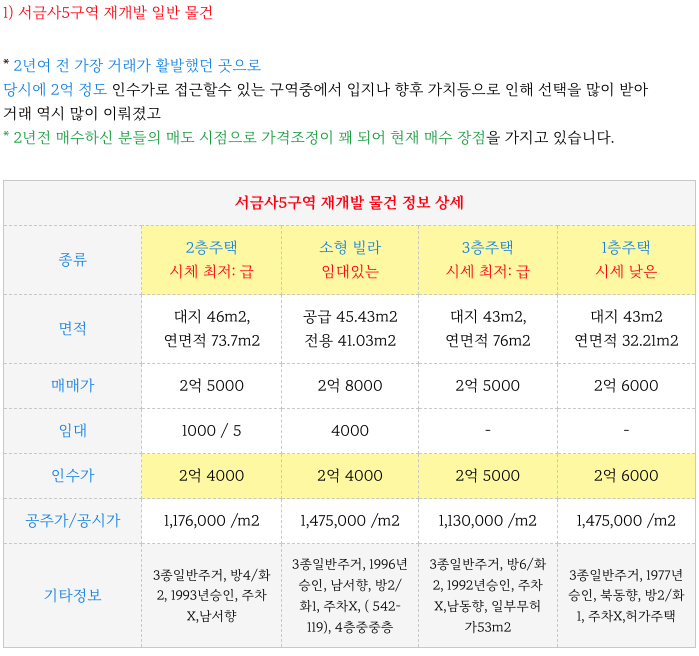 서금사5구역 재개발 빠르게 시세 최저 매매가, 인수가 급매물 물건들만 간략히 소개 해드리겠습니다.