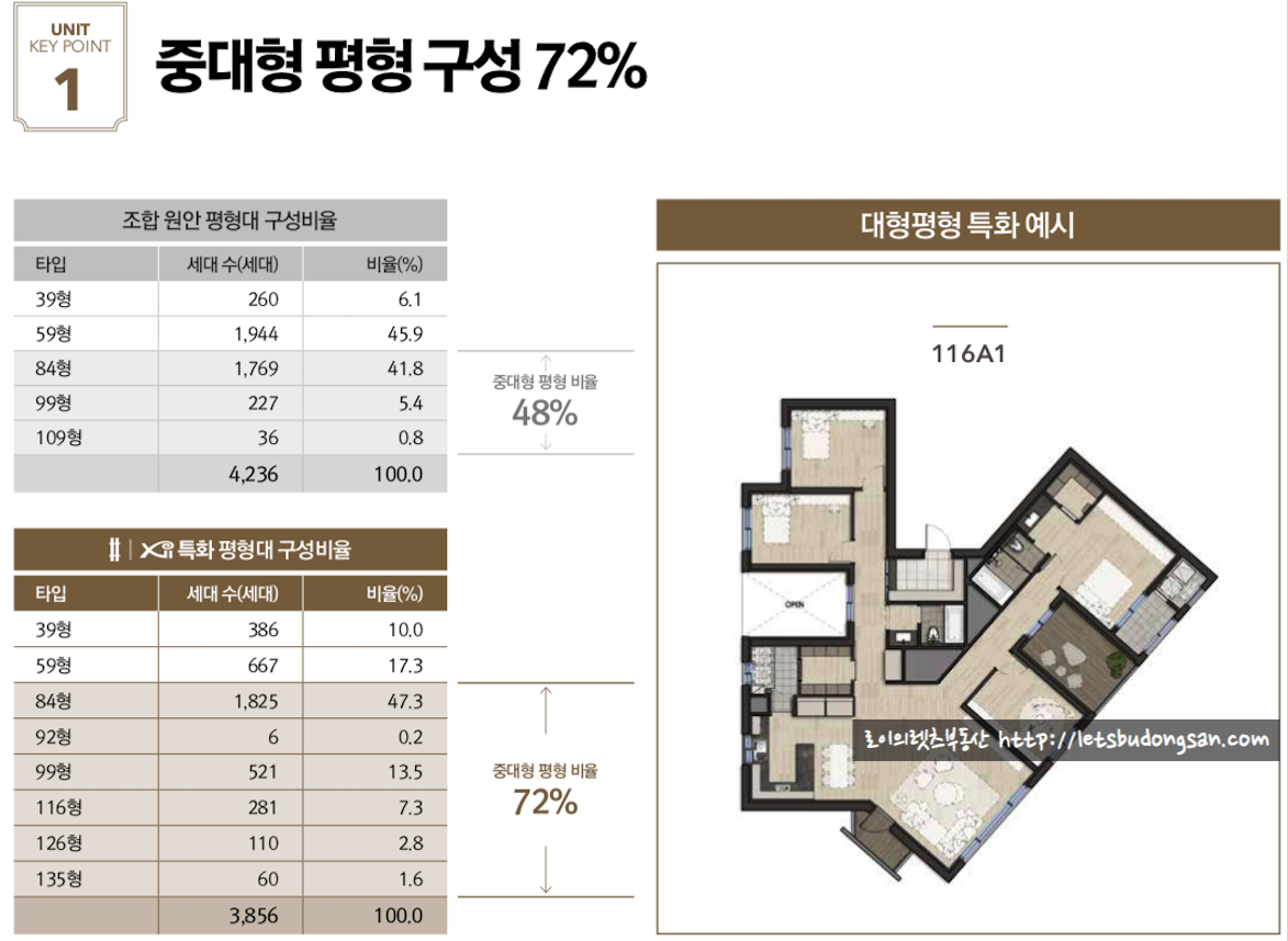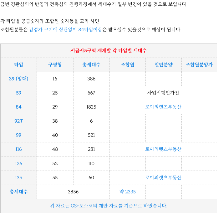서금사5구역 재개발의 시공사에서 제안안 각 타입 세대수 입니다.