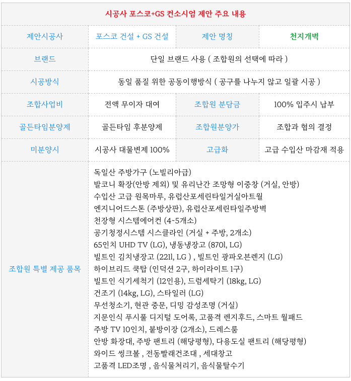 시공사인 포스코+GS 컨소시엄의 주요 제안 내용을 정리하여 드립니다.