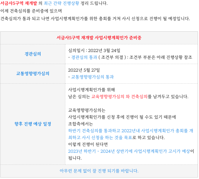 조합 내부적으로는 조합원들의 참여율과 열의가 높아 빠르게 진행이 되고 있습니다.