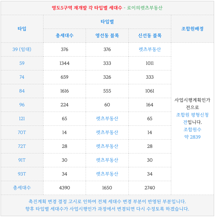 영도5구역 재개발의 변경결정고시 기준를 통한 타입별 세대수 입니다.