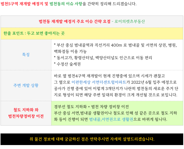 범천5구역 재개발에 궁금하신 사항은 연락주시면 자세히 설명드리겠습니다.