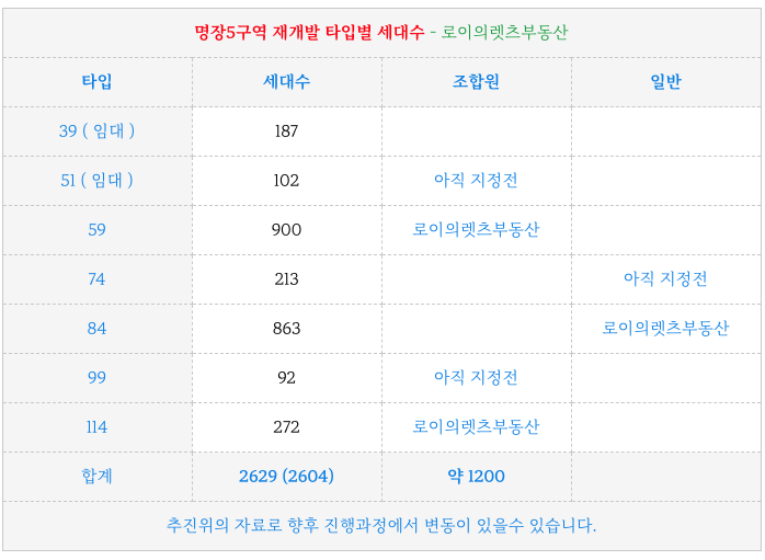 명장5구역 재개발 예정지의 예상 타입별 세대수 입니다.