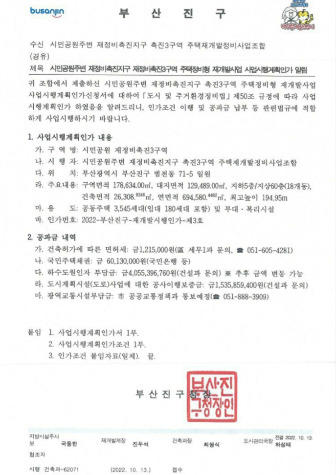 시민공원 촉진3구역 재개발 은 1년 6개월 여만에 드디어 사업시행계획인가를 득하였습니다.
