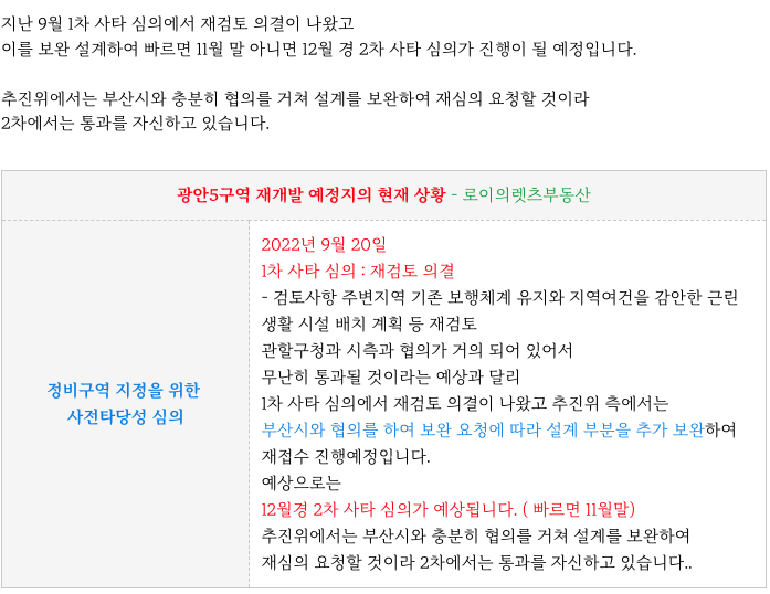 광안5구역 재개발 예정지는 12월경 사타 재심의가 있을 것으로 예상 됩니다.