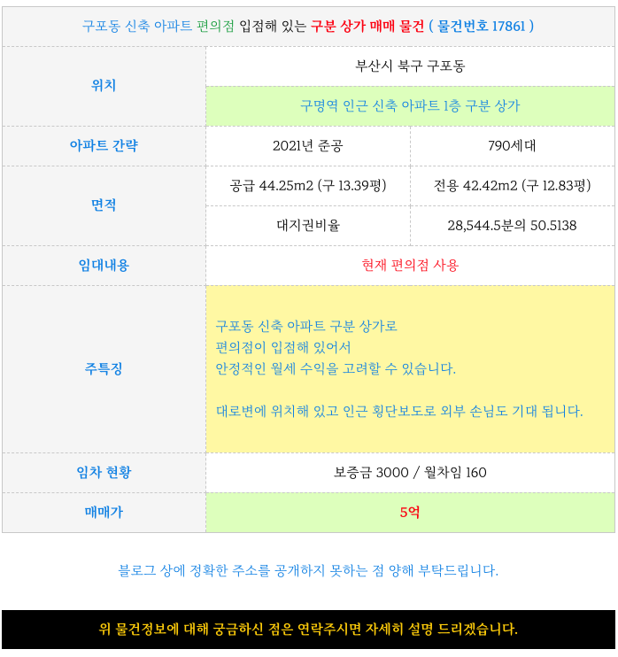 오늘 구포동 신축 아파트 편의점 입점해 있는 구분 상가 매매 물건 정보 정리하여 드리겠습니다.