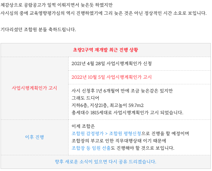 많은 분들이 기다리고 기다렸던 사업시행계획인가 고시가 1년 6개월여 만에 드디어 득하였습니다.