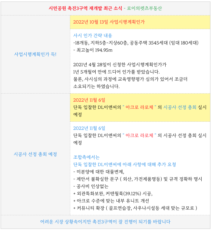 촉진3구역 재개발 의 현재까지의 진행과정 정리 등 추가 정보는 아래 페이지를 참고 부탁드립니다.
