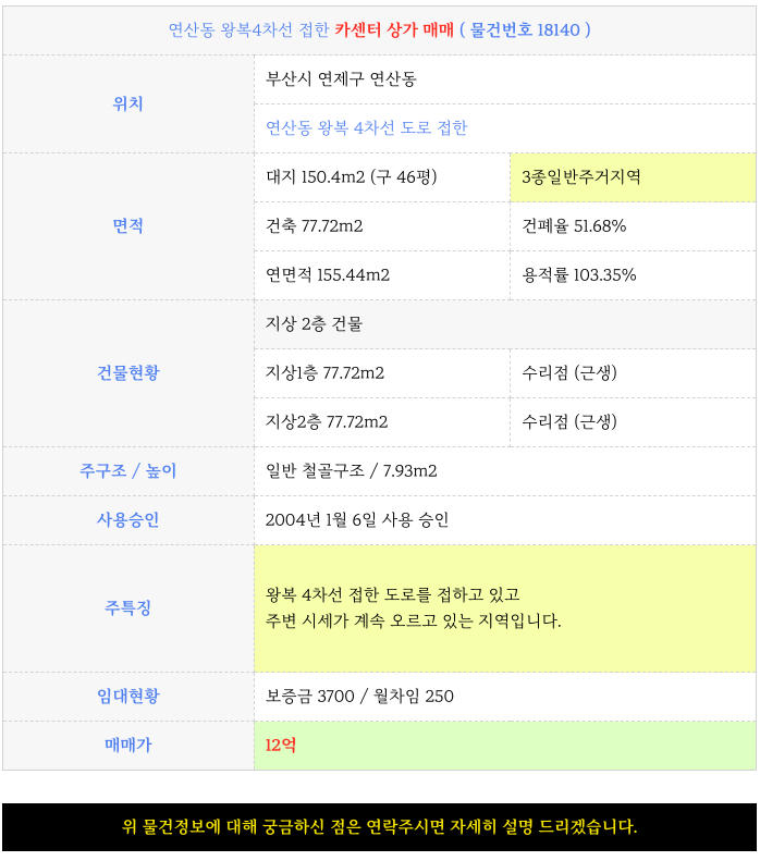 연산동 4차선 도로접한 카센터 상가 매매 물건
