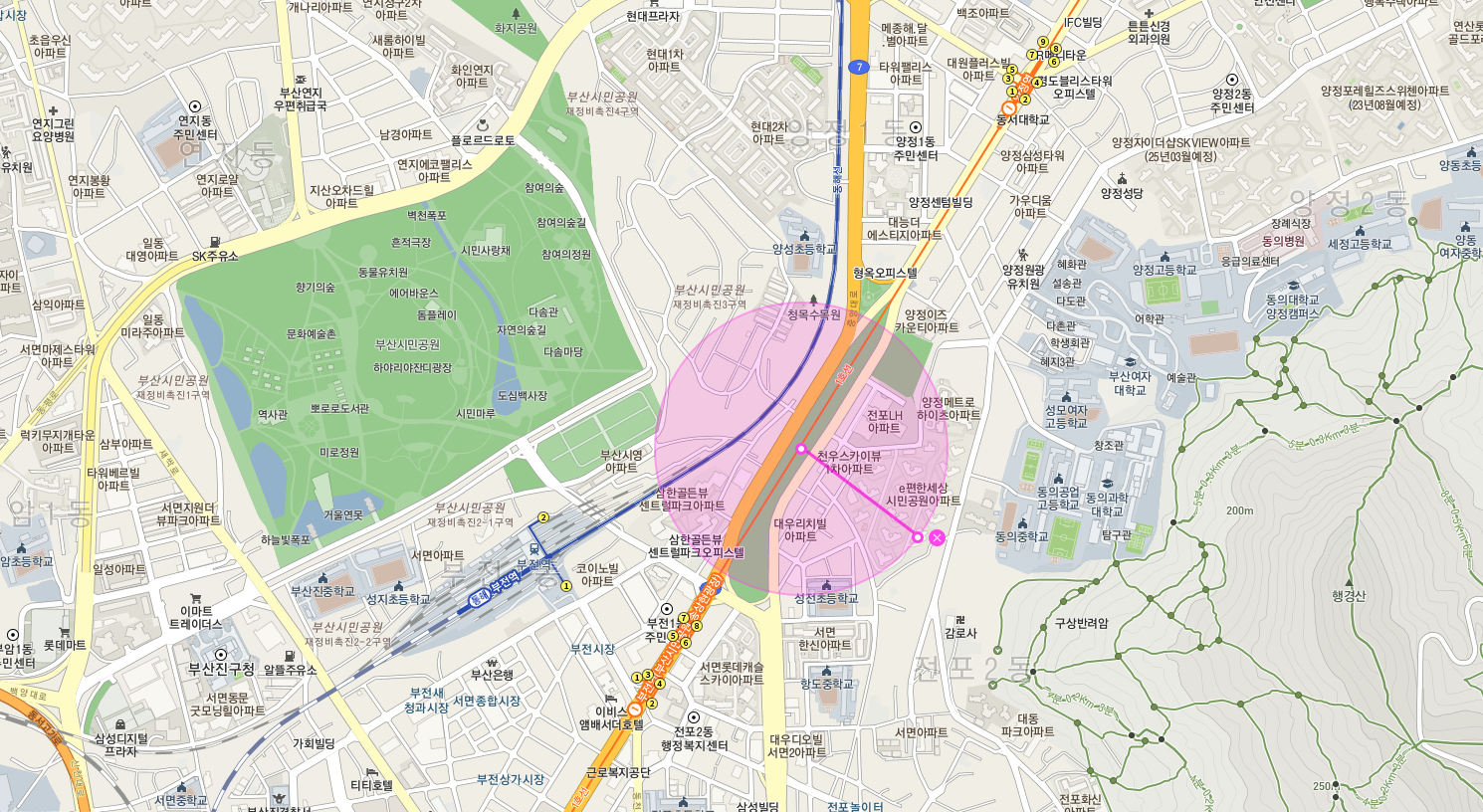 지하철과 곧 입주 예정인 1400여세대 이편한세상 시민공원 아파트의 이동 동선에
