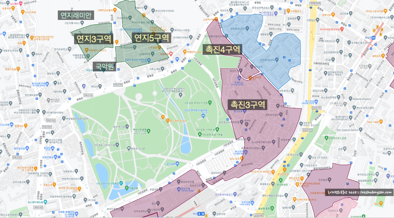 부산 시민공원과 국립국악원 그리고 시세 높은 연지래미안어반파크 사이에 위치한 재개발 예정지로