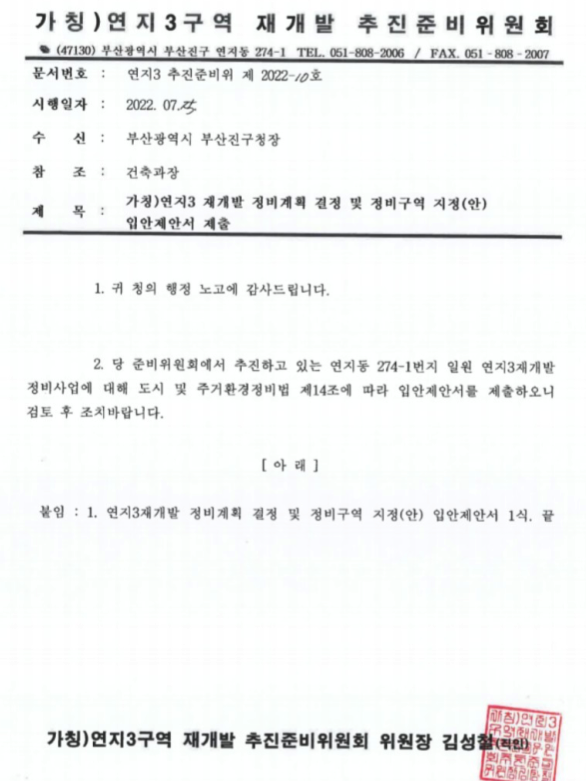 지난 7월 25일 정비 구역 지정 신청을 접수하고 각 관련부서와 협의 및 보완 조치를 하고 있습니다.