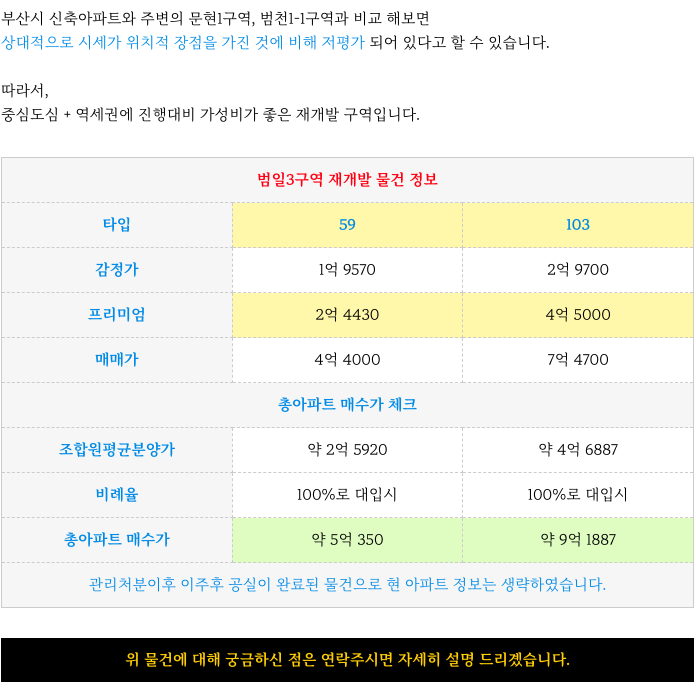 범일3구역 재개발 59타입, 103타입 매물 소개