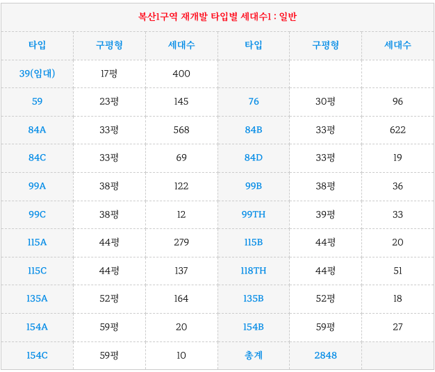복산1구역 재개발 의 각 타입별 세대수입니다.