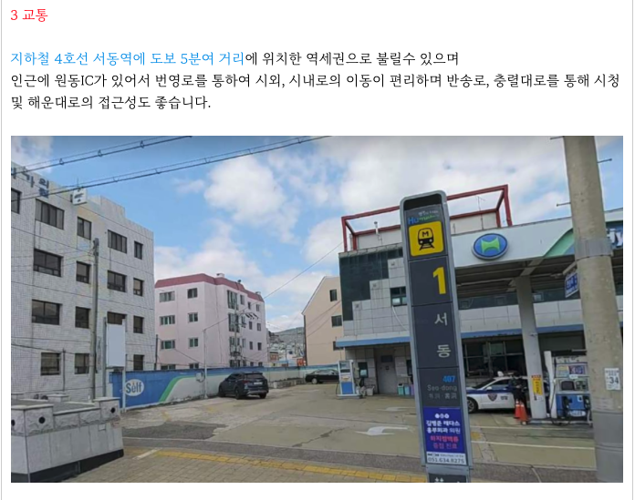 지하철 4호선 서동역에 도보 5분여 거리에 위치한 역세권으로 불릴수 있으며