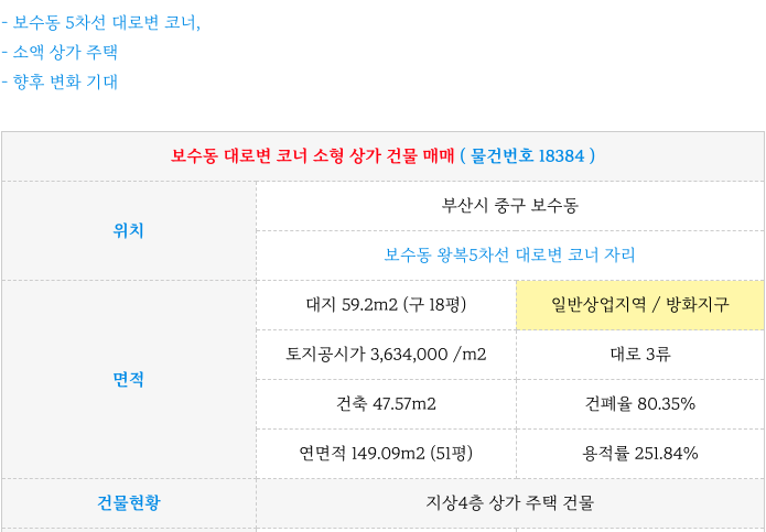 부산 중구 보수동 대로변 코너 소형 5.5억 상가 매매