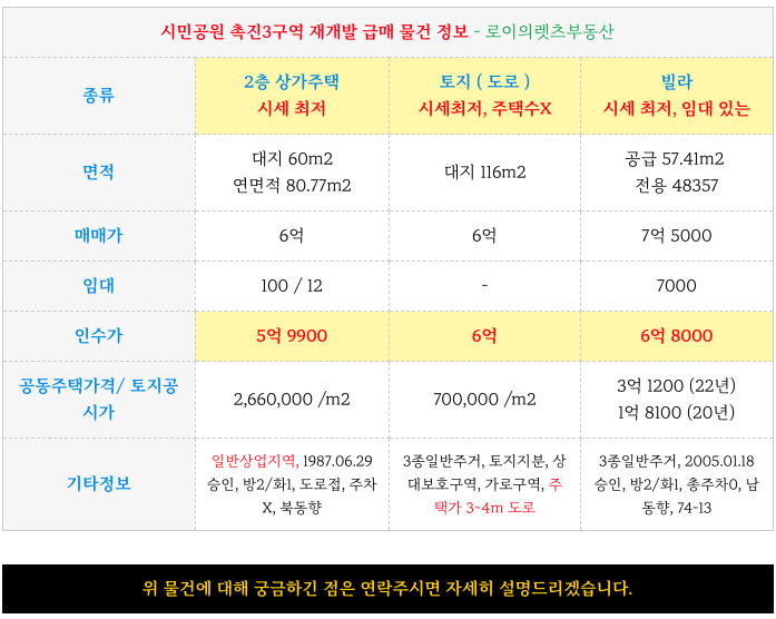 시민공원 촉진3구역 재개발 시세 최저라고 자부는 급매 물건만 엄선하여 소개해 드리겠습니다.