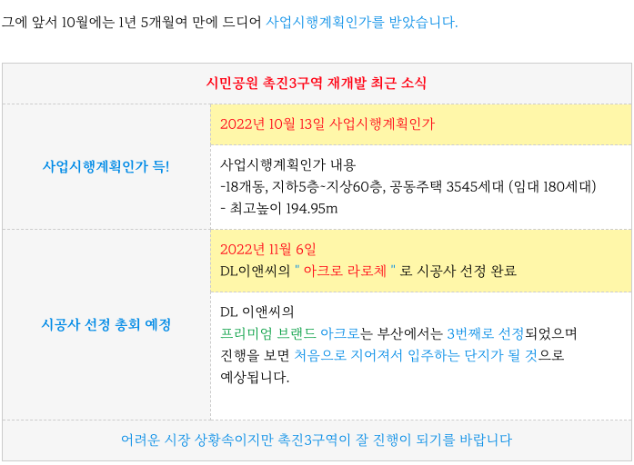 2022년 11월 6일 최종적으로 DL 이앤시를 시공사로 선정하였습니다.