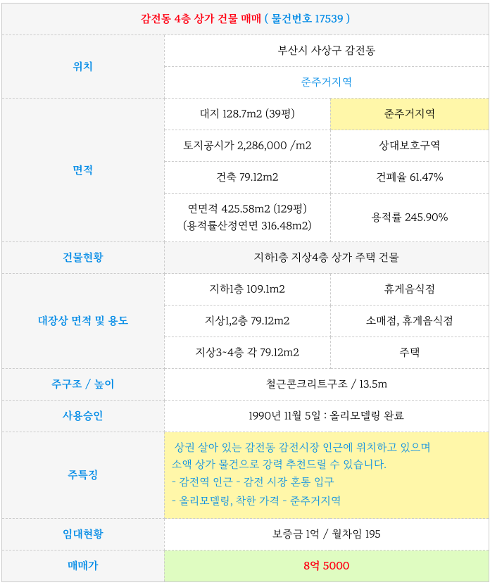 올리모델링 되어 있고 감전시장 혼통 인근 상권으로 8억대라는 가격대로