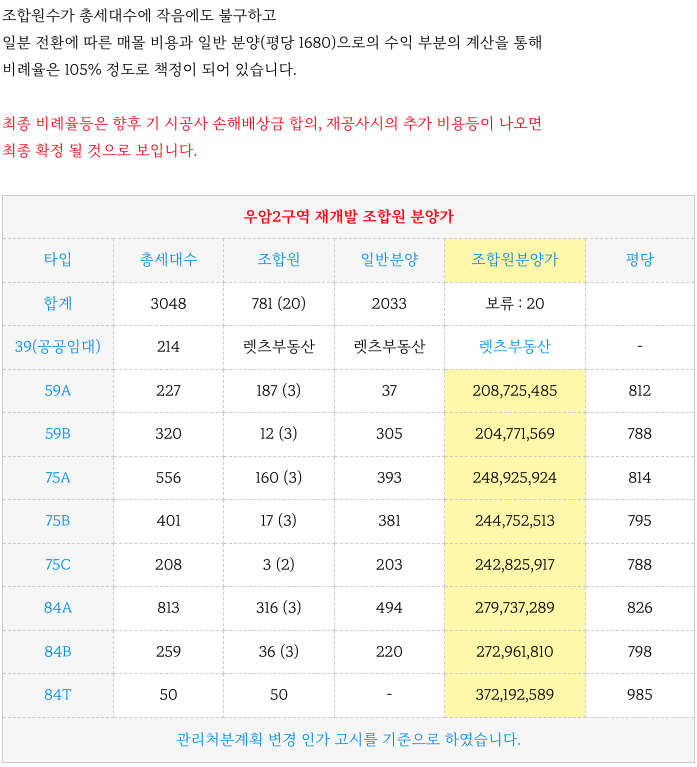 우암2구역 재개발의 관처변경인가에 따른 타입별 세대수와 조합원 분양가 입니다.