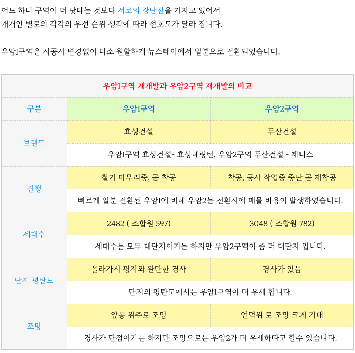 우암2구역 재개발 vs 우암1구역 재개발의 간략 비교 부분이니 참고로 보시면 되십니다.