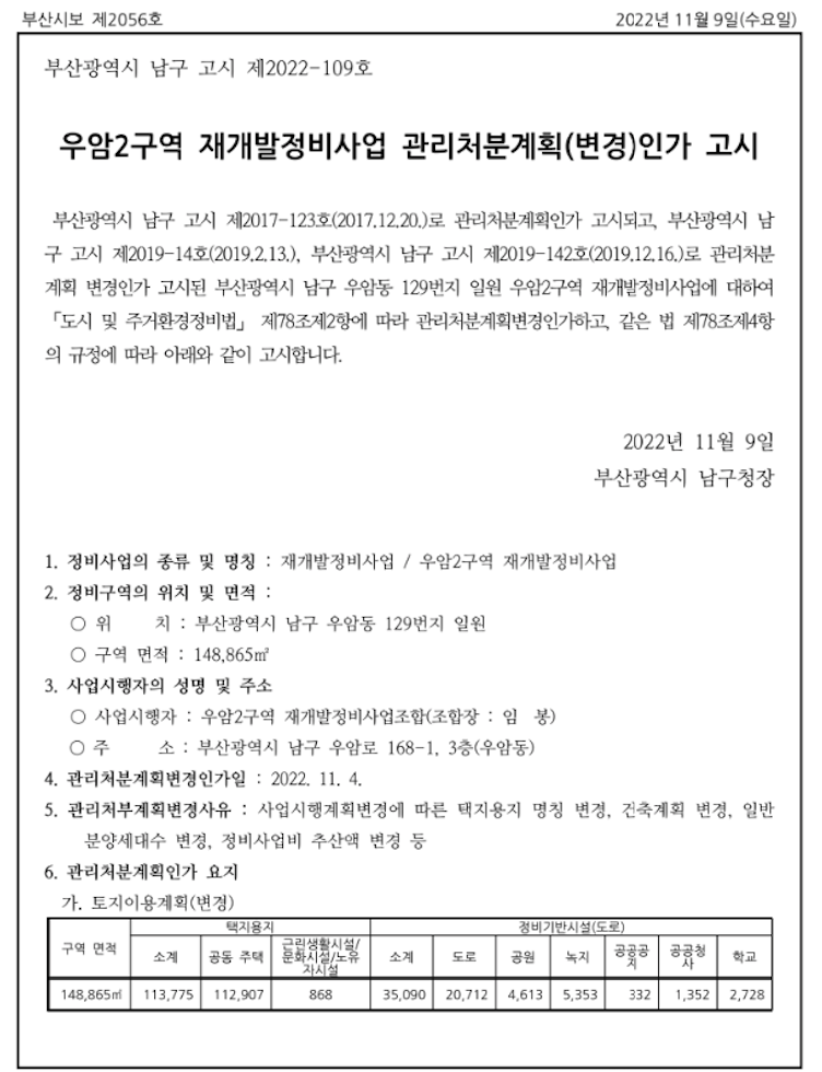 우암2구역 재개발은 사업시행계획인가 변경에 이어 관리처분계획인가 변경까지 고시 되었습니다.