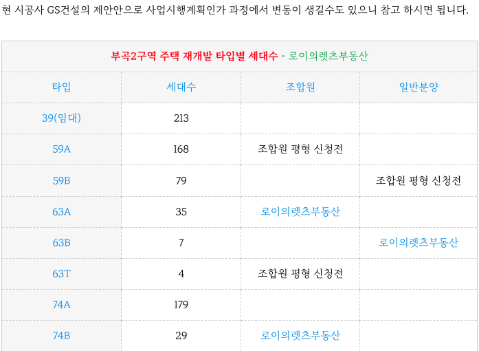 부곡2구역 재개발의 GS건설이 제안안 각 타입별 세대수 입니다.