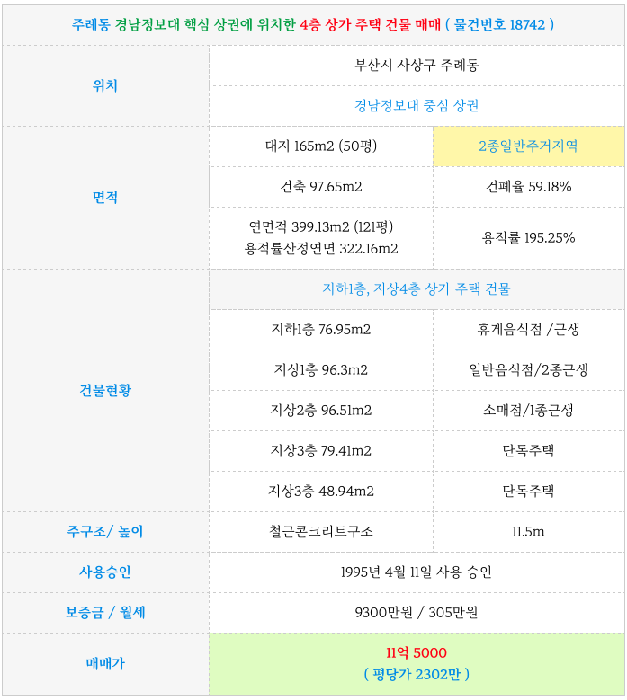 주례동 냉정역 ~ 경남정보대 후문 4층 상가 주택 / 3층 올근생 상가 건물 매매