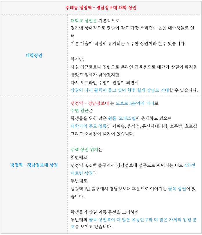아래 물건은 경남정보대 상권의 주력인 후문쪽에 바로 가까이 있어 입지가 아주 좋은 매물 입니다.