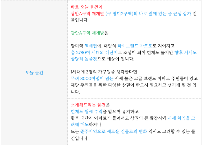 오늘 물건은 현재의 수익과 향후의 미래가치 모두를 고려할 수 있는 물건입니다.