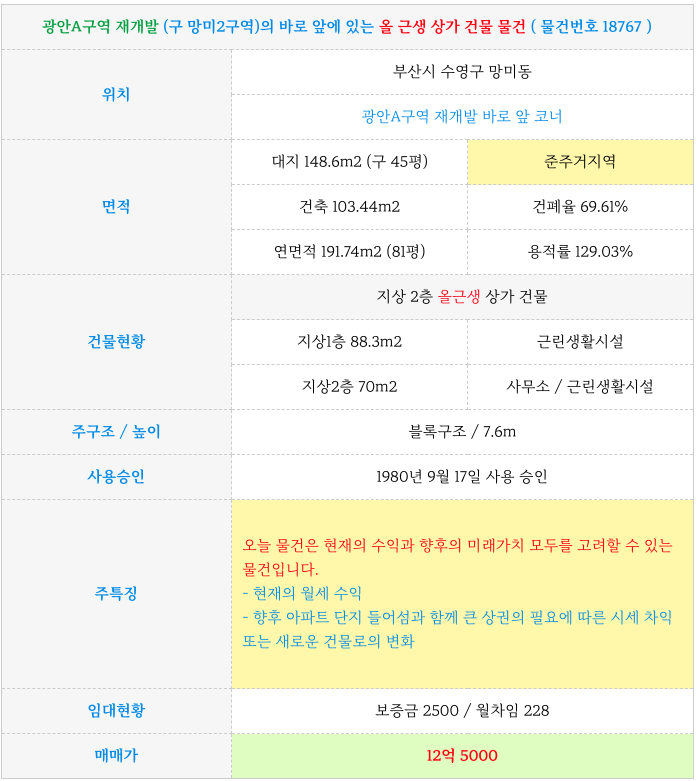 광안A구역 재개발 (구 망미2구역)의 바로 앞에 있는 올 근생 상가 건물 물건을 정리해 드리겠습니다.