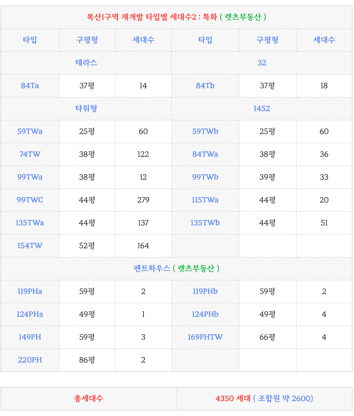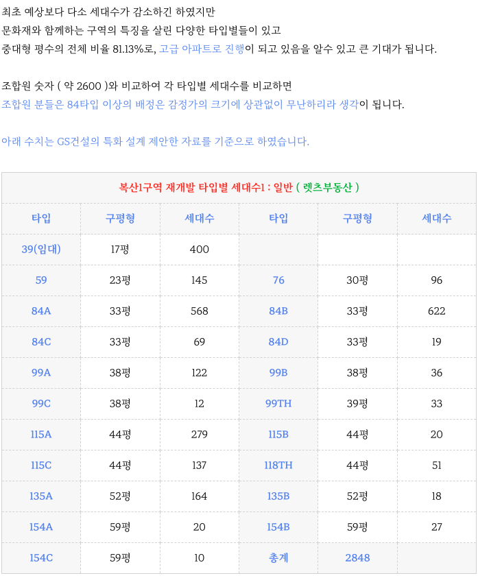 복산1구역 재개발 의 금번 GS건설의 특화 설계 제안을 통한 각 타입별 세대수입니다.