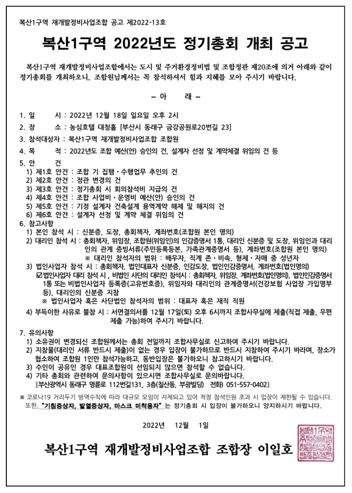 복산1구역 재개발 ( 동래자이 더 헤리티지) 는 정기총회를 앞두고 있습니다.