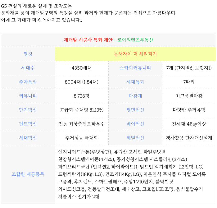 복산1구역 재개발 의 시공사의 새로운 고급화 / 특화 제안 내용 부분 입니다.
